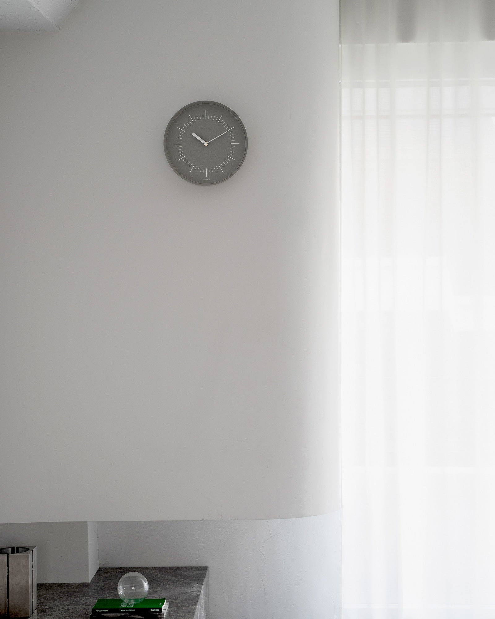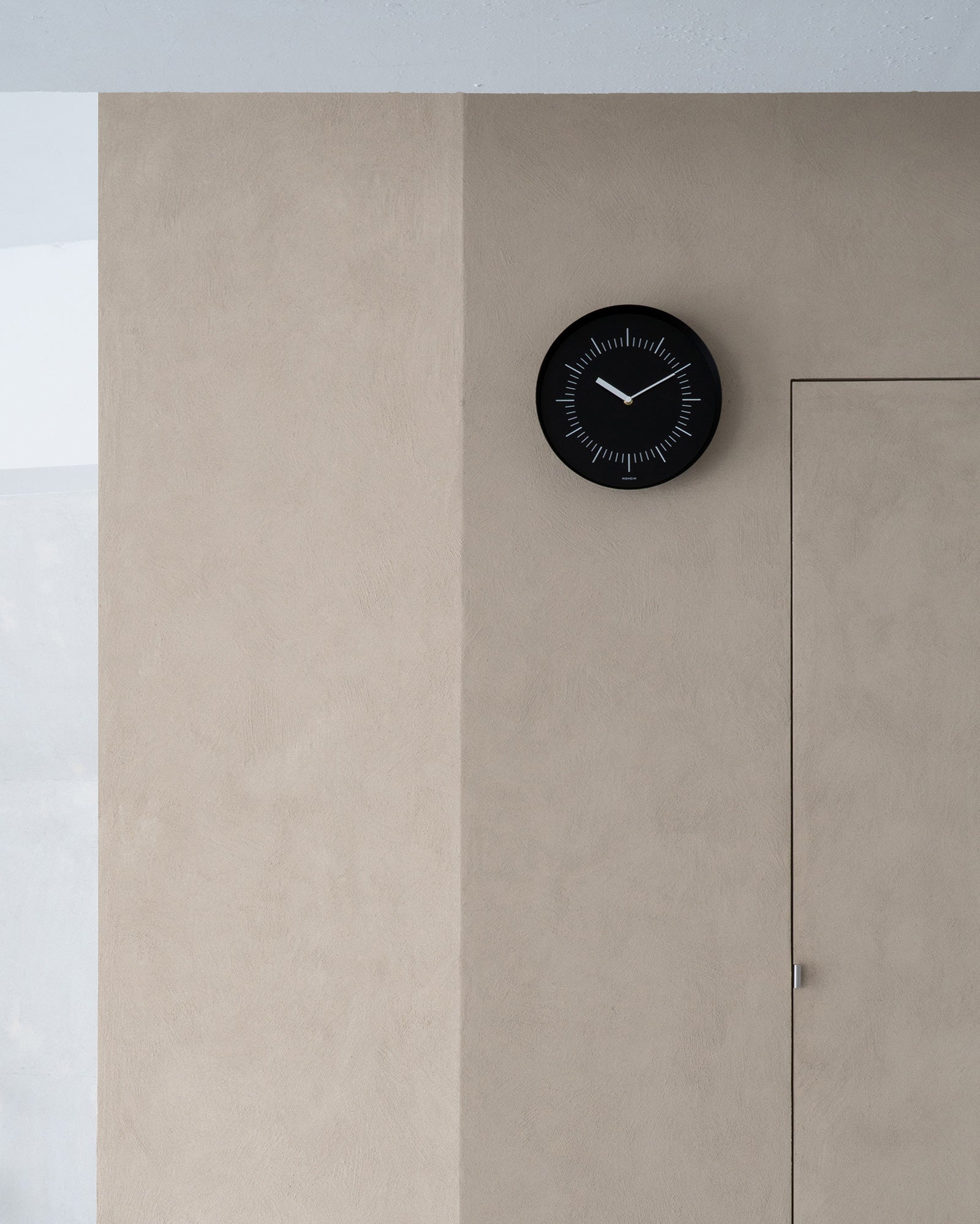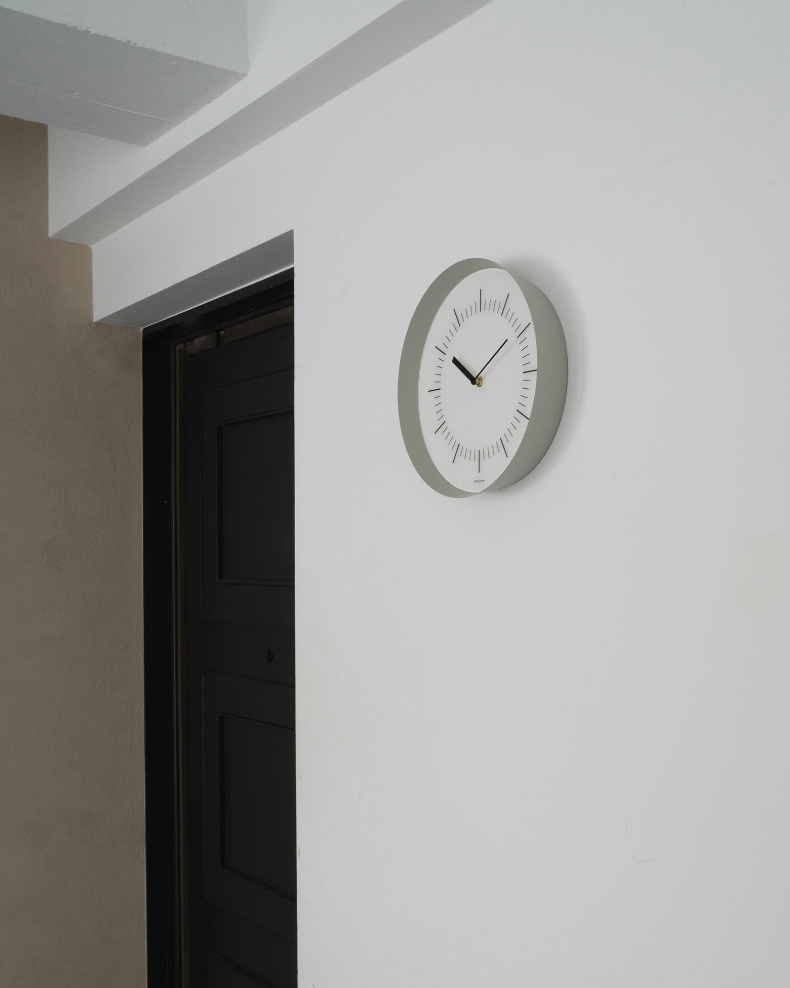HORN is a wall clock that features a basic and simple design when viewed from the front, yet changes its expression depending on the angle. By adding expansive depth to its flat face, it maintains a distinct presence as a timepiece while blending into its surroundings like a mirror.