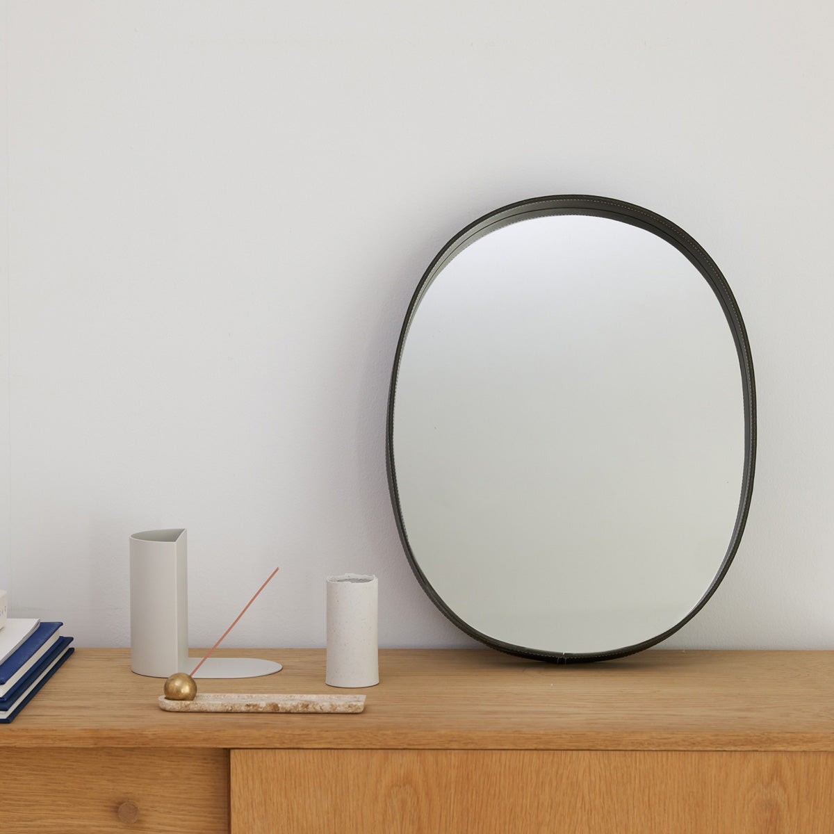 Retro oval-shape united with leather frame has turned the classic round-shaped mirror into this sophisticated and elegant wall mirror. The delicate hand stitch as well as diligent handwork to frame the mirror by leather craftsmen is undoubtedly worthwhile feeling over decades.